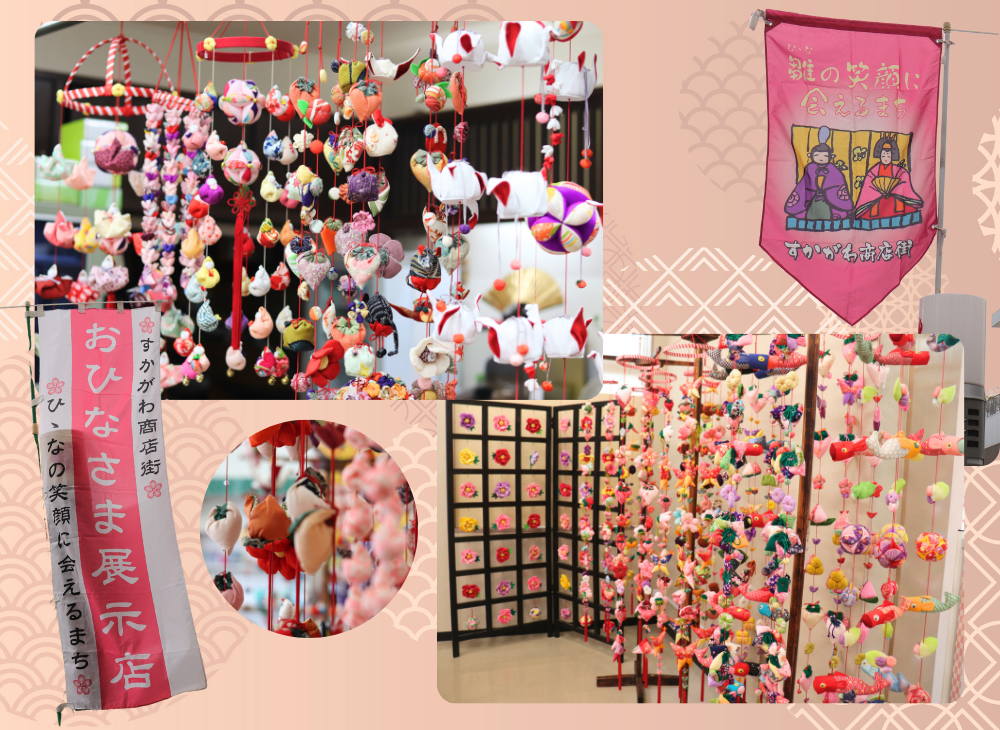 須賀川商工会議所女性会が中心となって制作や展示に励んでいる「つるし雛」や各々の商店が受け継いできた古くは明治時代からの雛人形や段飾り雛が、まちなかの商店を彩ります。