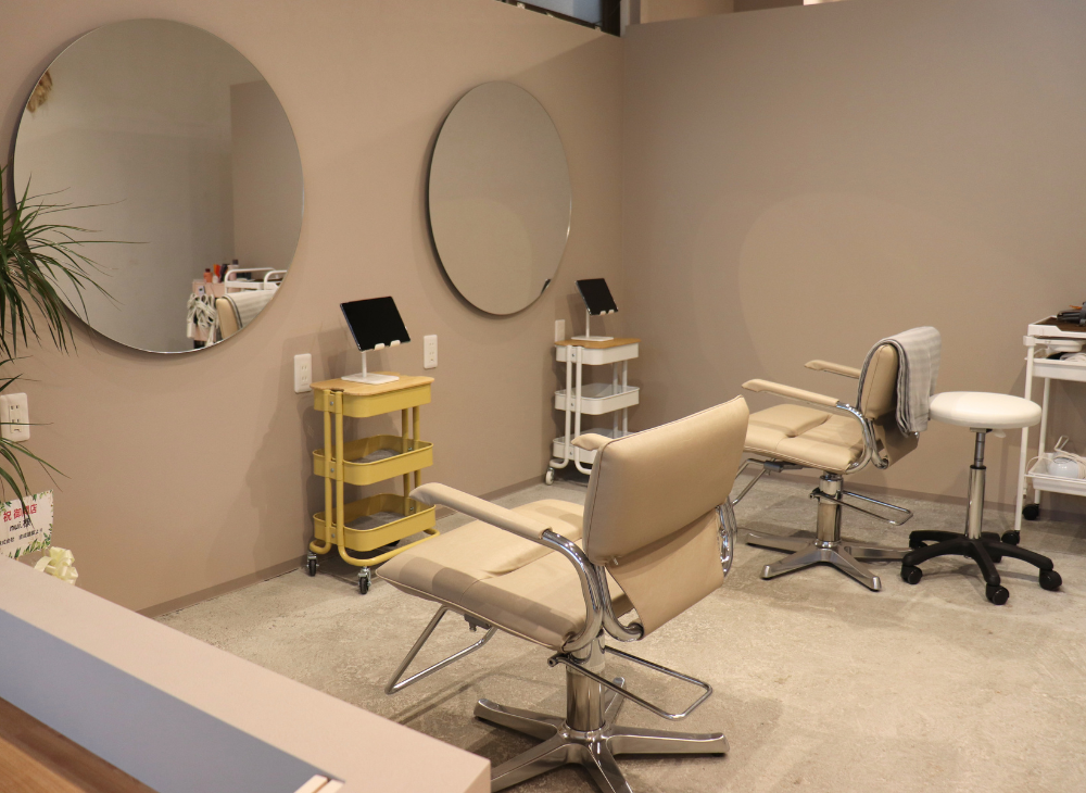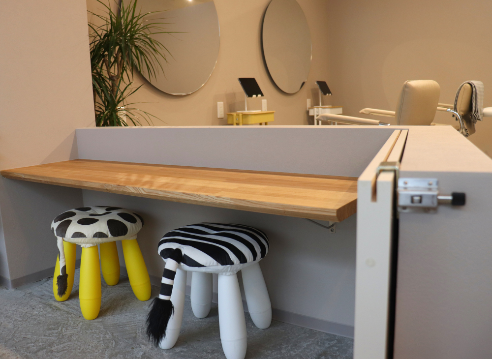 お子様連れでのご来店も大歓迎という「nui.」さんでは、入り口にはかわいらしい椅子のあるキッズスペースも。こちらは施術中のママさんからお子さまがすぐ確認できるようなママさんには安心の設計になっています。